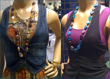 These two mannequins in a store window kindly demonstrated the difference between jewelry that matches your outfit (on the left) and jewelry that contrasts with it (on the right):